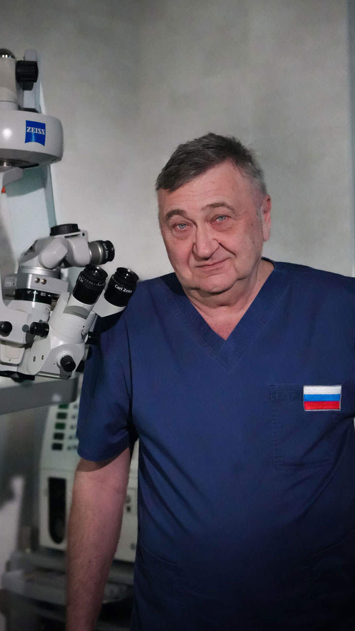 Главный врач клиники. Офтальмолог с более чем 40-летним стажем, ведущий офтальмохирург. Кандидат медицинских наук, профессор Академии военных наук РФ. Отличник здравоохранения Российской Федерации. Лечит заболевания глаз, век, орбиты и слёзных путей и их осложнения при сахарном диабете (диабетическая ретинопатия) и других заболеваниях. В лечении использует как большой опыт регенеративной хирургии биоматериалами Аллоплант, накопленный за десятки лет работы во Всероссийском Центре глазной и пластической хирургии, так и лучшие достижения современной мировой офтальмологии.